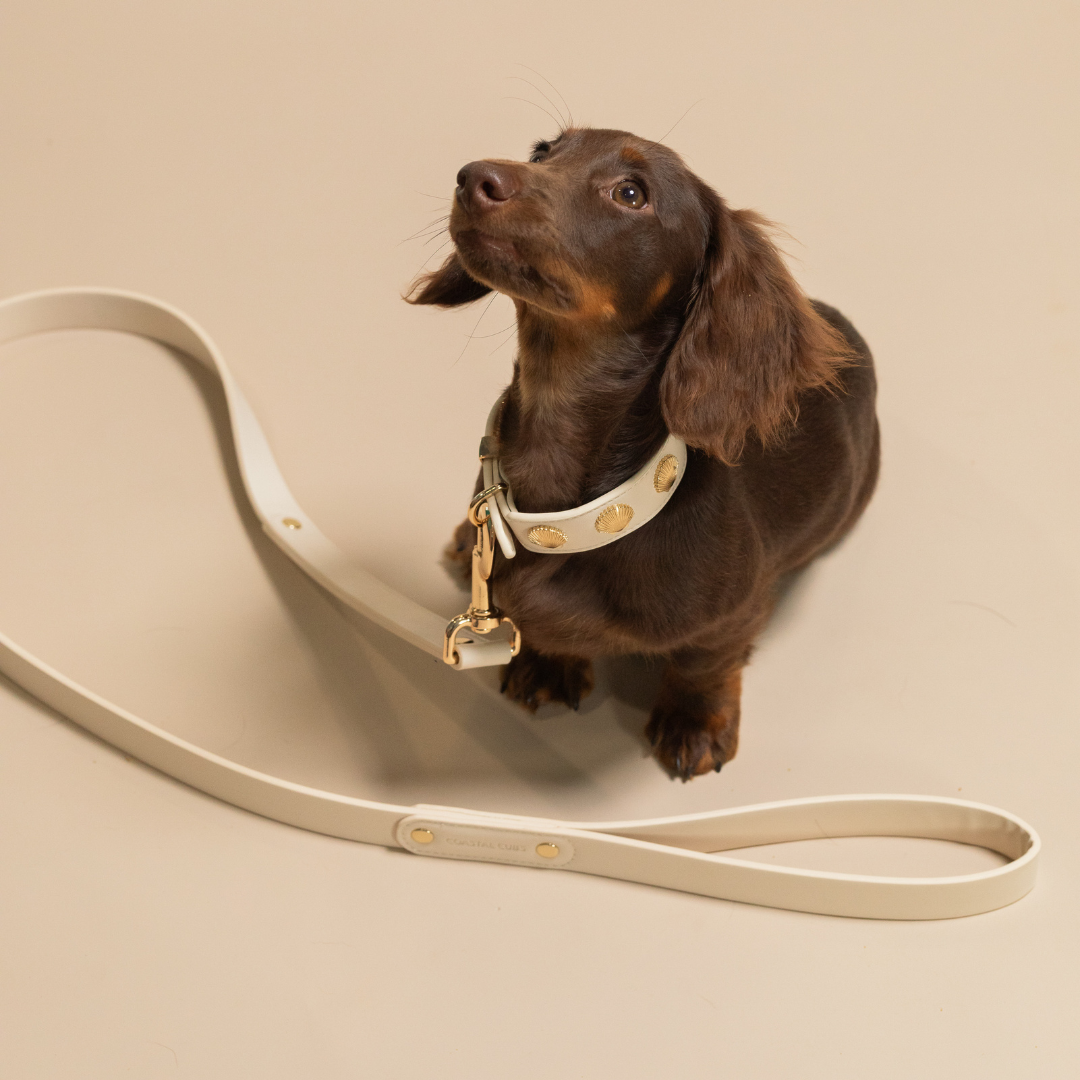 Such a stylish collar I wish it came with matching name tags, harness and leash. I would buy it all. Even though it’s a light colour any dirt comes off easily.