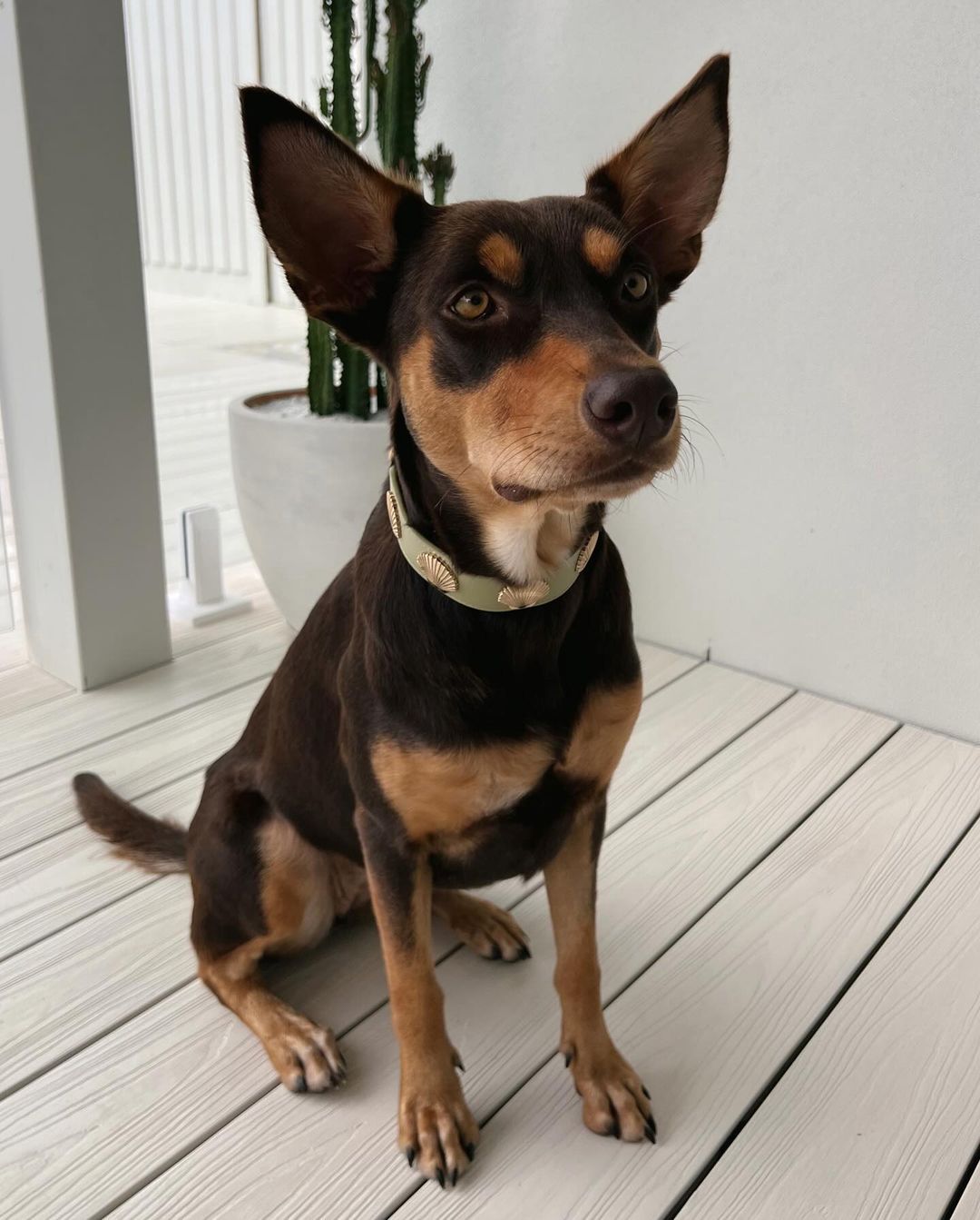 Such a stylish collar I wish it came with matching name tags, harness and leash. I would buy it all. Even though it’s a light colour any dirt comes off easily.